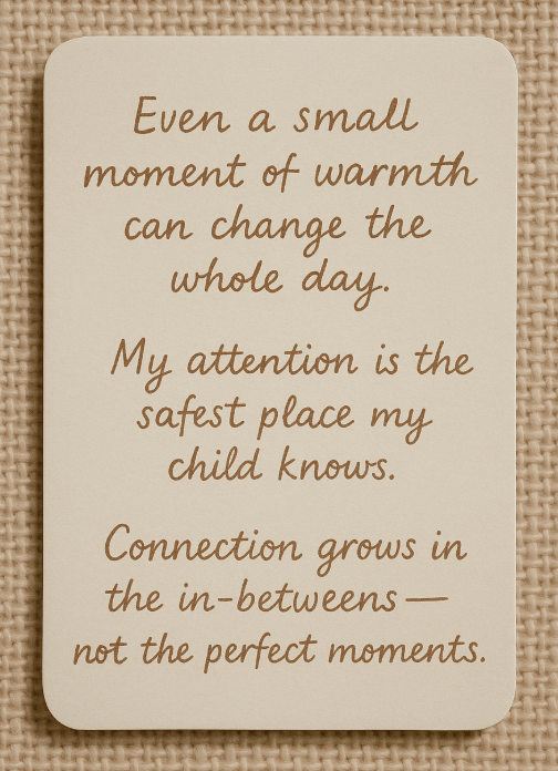 When we think about connection, we often imagine big gestures — special outings, heart-to-heart talks, or milestone moments. But the truth is, connection is built in the micro-moments — the small, repeated signals that whisper: “I see you. You matter to me.”