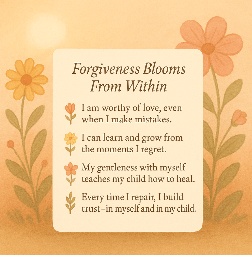 Parenting asks us to guide our children toward kindness, empathy, and repair — yet so often, the hardest person to forgive is ourselves. Each moment of self-forgiveness plants a seed of compassion that your child will one day carry within their own heart.